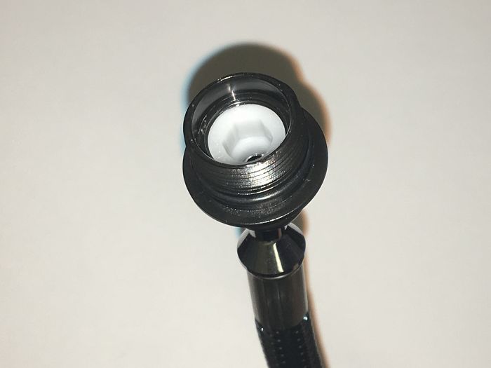 If you have one of these pictured to the right and water is coming from this area, check to make sure the white piece with the hexagonal hole is securely in place. A #8 metric allen wrench fits this piece and turning to the right hand-tight is all you need.